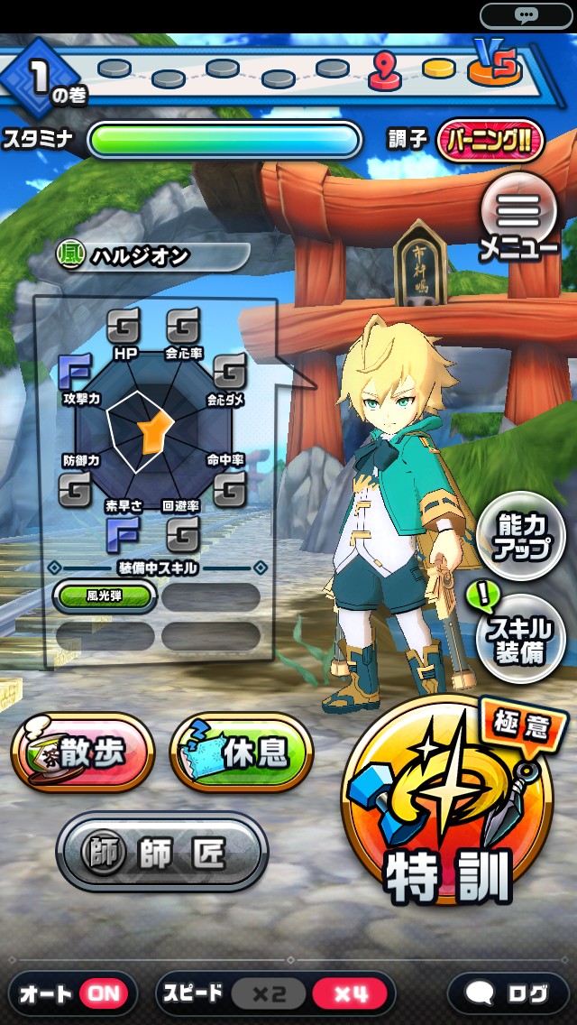 選択した特訓内容により上昇するステータスが異なるので、特訓内容の選択は優先して強化したいものの数値が大きく上がるものを選択するのがコツです。