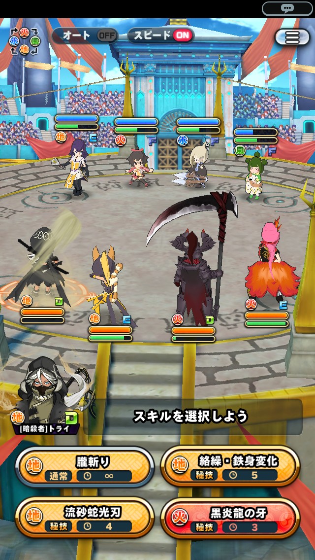 「クエスト」「闘技場」どちらもコマンドバトル形式になっており、キャラクターごとのコマンド内容は「修行」の内容で変化します。