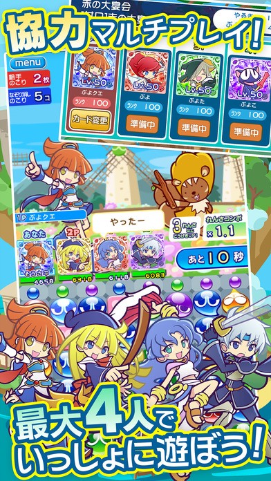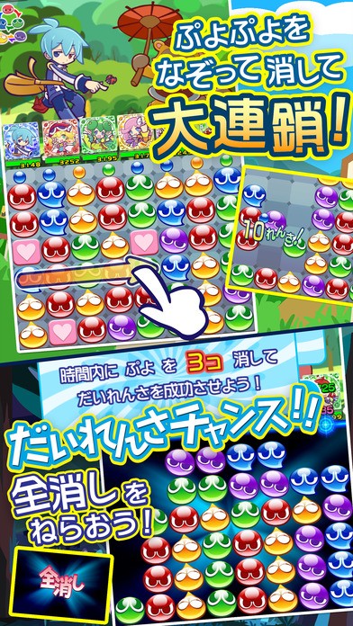 連鎖の爽快感はそのままでもっと手軽に楽しめるようになりました。消した色のぷよと同じ色のキャラがダメージを与えるので、たくさん消して敵を倒しましょう。