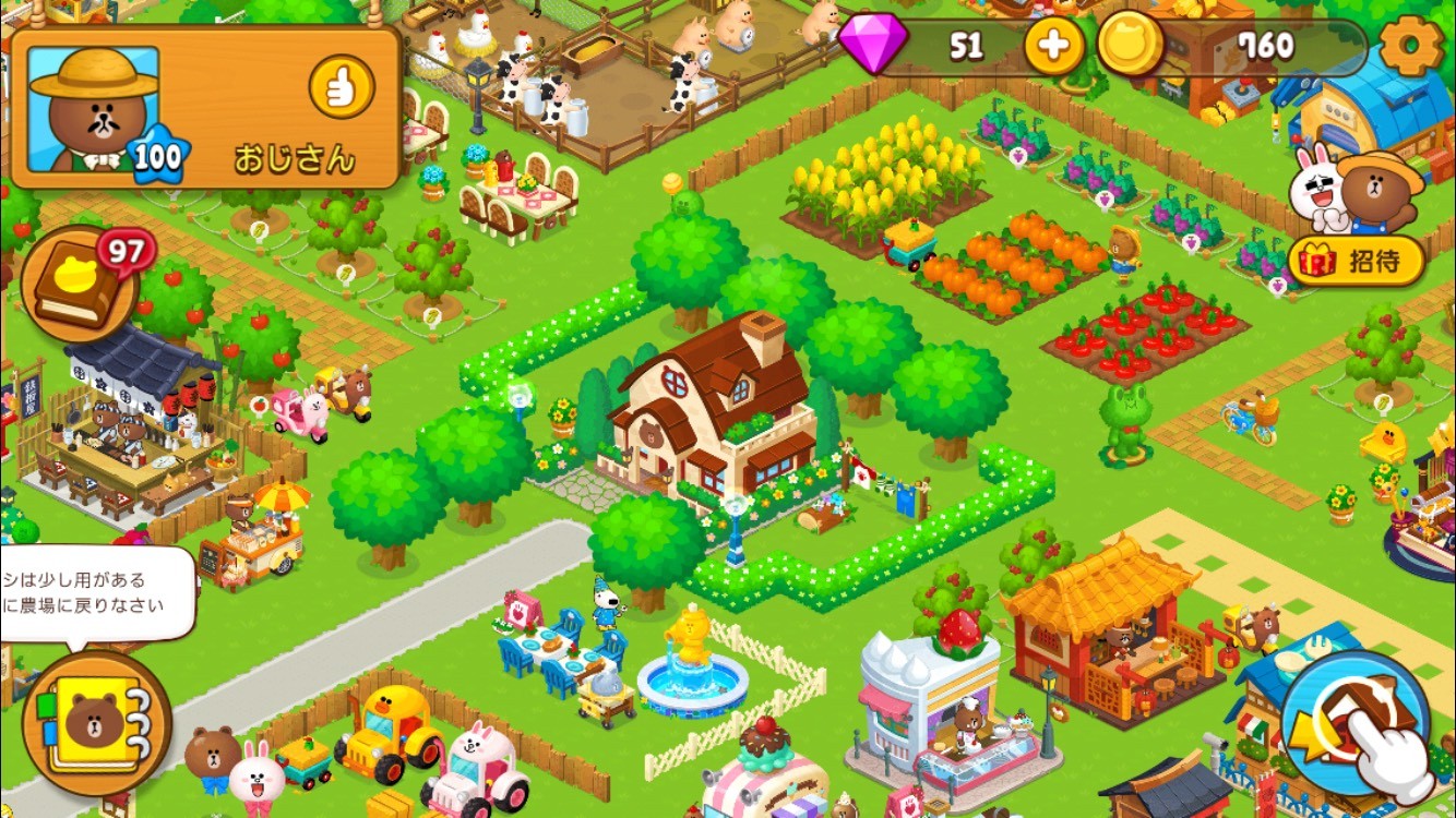 このアプリゲームはLINEに出てくるブラウンという茶色の熊のキャラクターを主人公にして農場をよりよく開発し、個性的な農場を作っていくというゲームです。