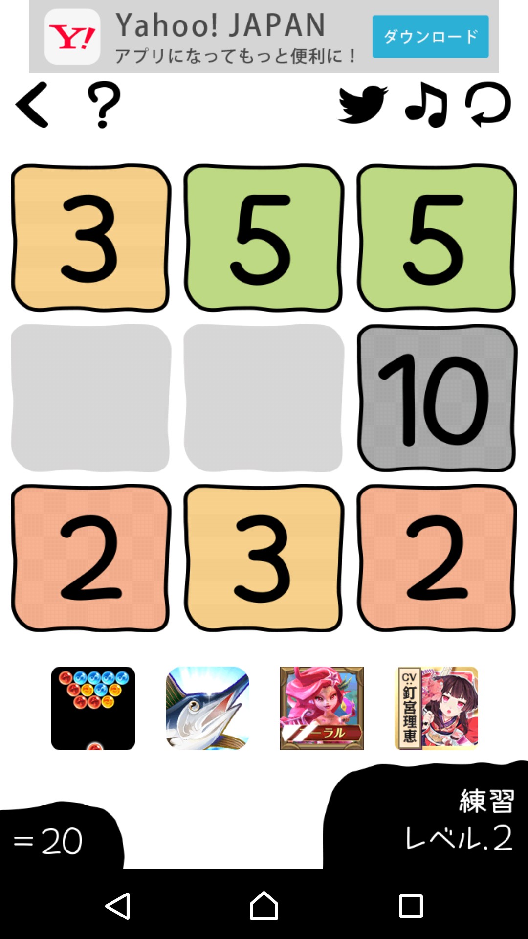 手始めに「練習」を開いてみました。画面上の数字の書かれたパネルをスライドさせ、合計が10になるようにそろえていきます。スライドしたパネルは画面の反対端へ行くか他のパネルに接触するまで止まりません。一旦10ができてしまうとそのパネルはスライドすることができなくなります。また、パネルをすべて使い切らないとクリアになりません。
