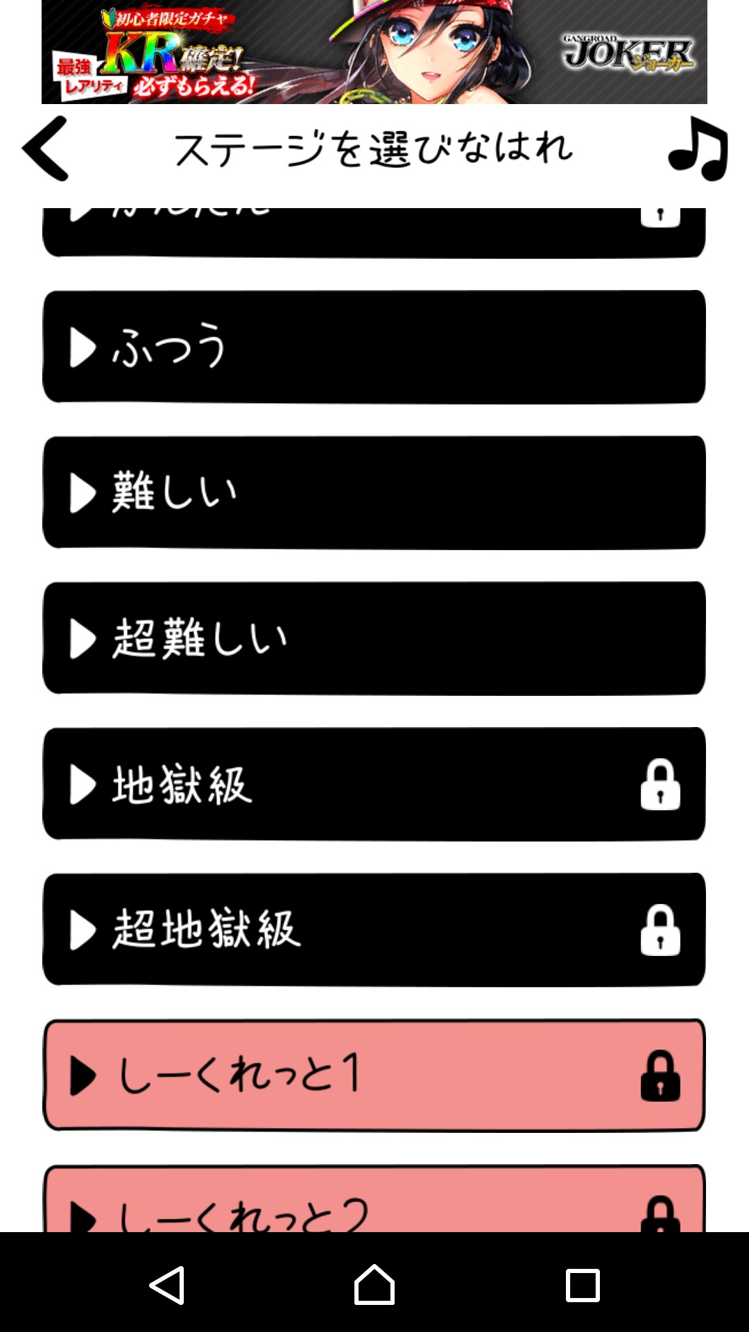 「かんたん」は、このアプリのレビューを書くと開放され、「地獄級」「超地獄級」は、それらより低レベルのステージをすべてクリアすると開放されます。また、「しーくれっと」は動画広告を観ることで開放されます。
