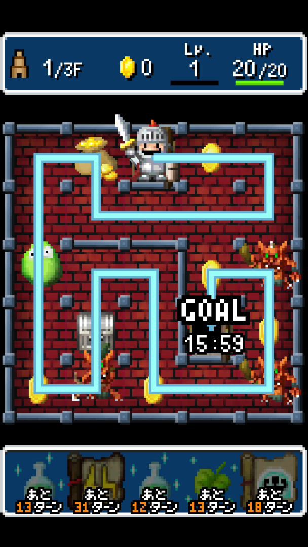 階層ごとに、一筆でなぞり出口を目指しますが、マスにモンスター、アイテム・宝箱、罠などが配置されています。