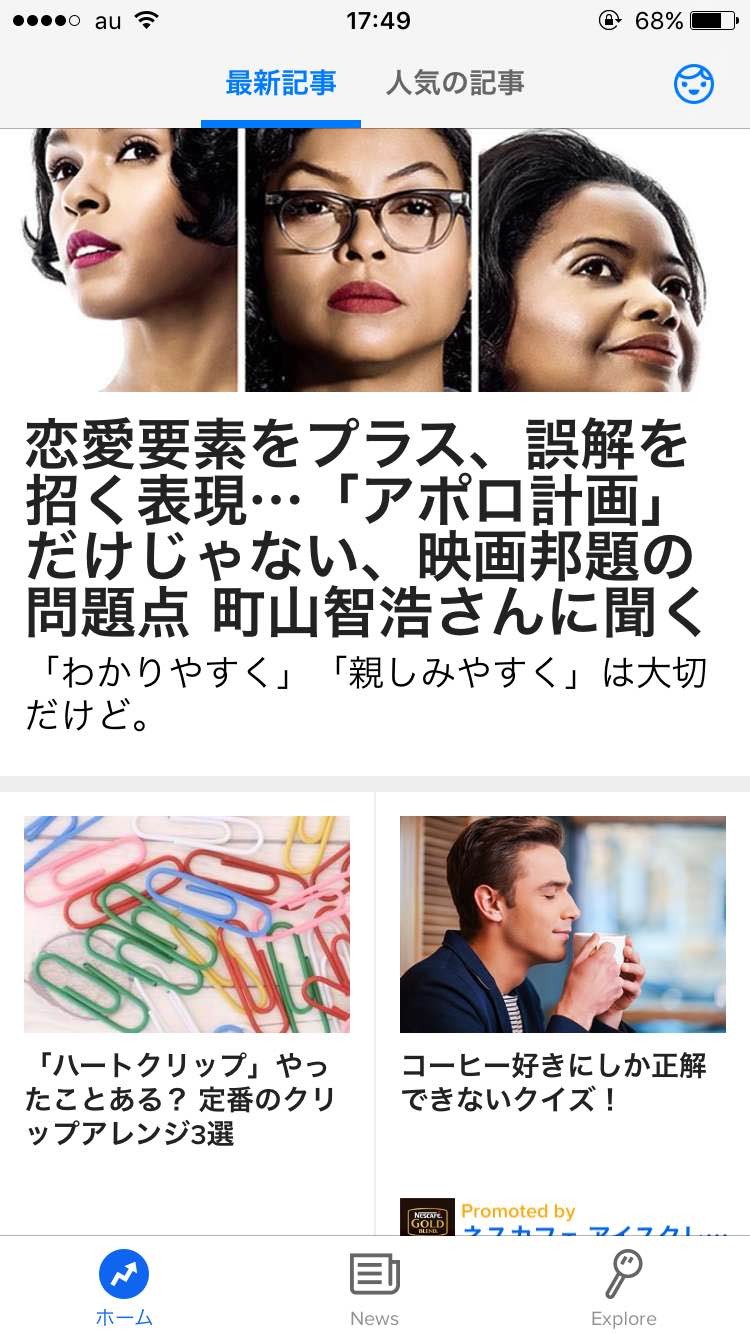 こちらがアプリのトップ画面です。「最新記事」「人気の記事」が1ボタンで切り替え可能で、それぞれに素早くアクセスできます。画面下部には「ホーム」「News」「Explore」と分かれていて、こちらからも各コンテンツにアクセス可能です、シンプルなアプリなので操作は簡単です。