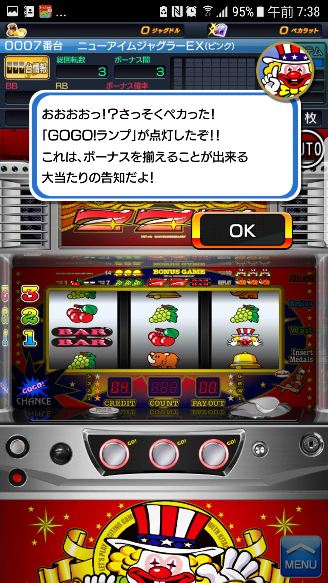 パチスロ筐体のボタン以外の部分をタップした時に、自動的に一手ずつプレイが進む。