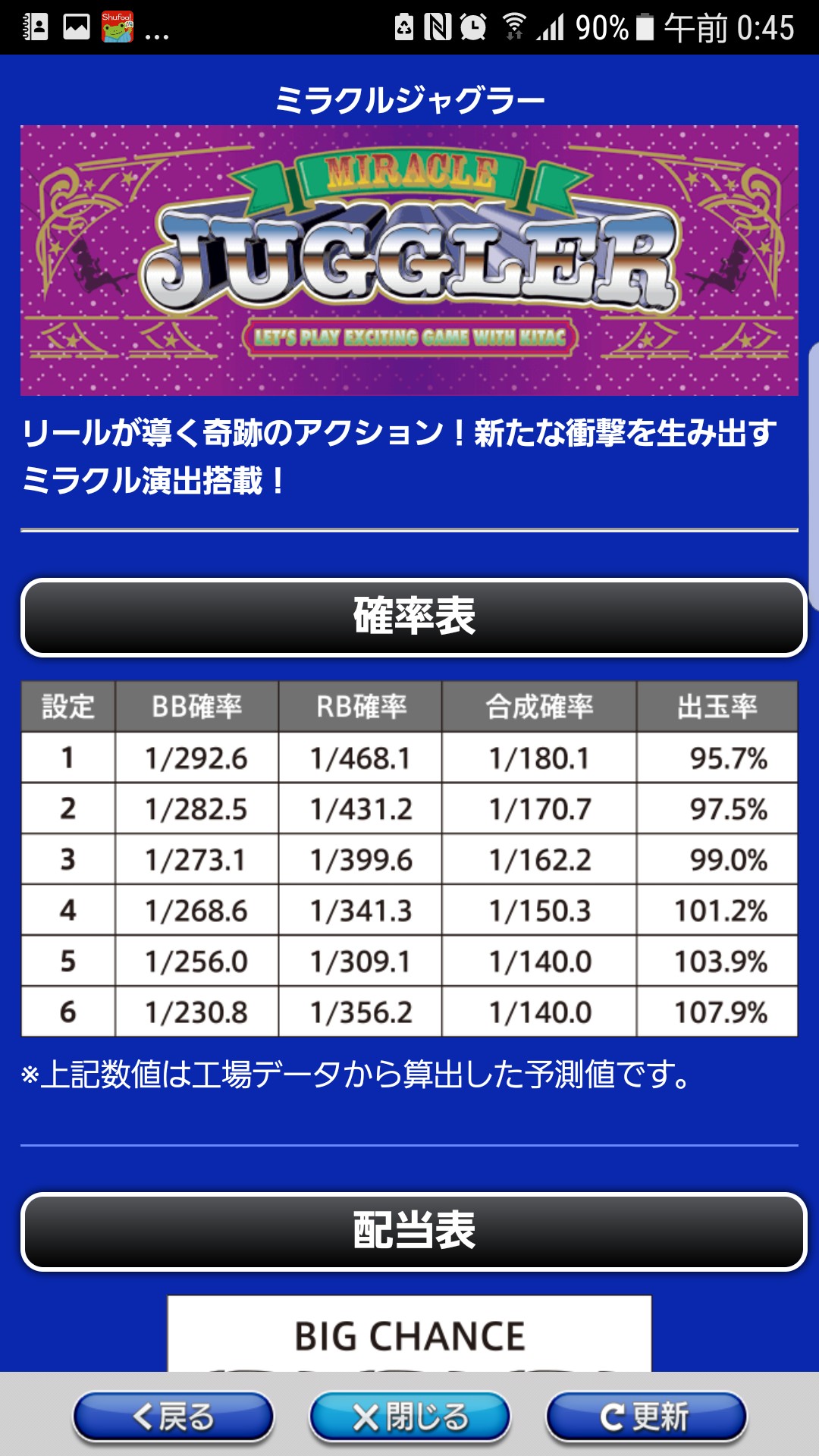 「確率表」では設定1〜6の各設定の「BB(ビッグボーナス)確率」「RB(レギュラーボーナス)確率」「合成確率」「出玉率」を