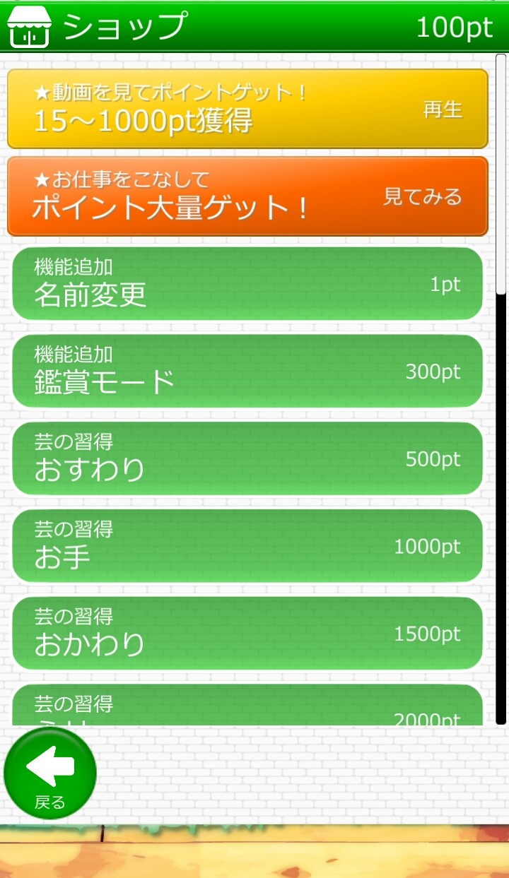 ショップではポイントを消費しておすわりやお手といった芸の習得をすることができます。