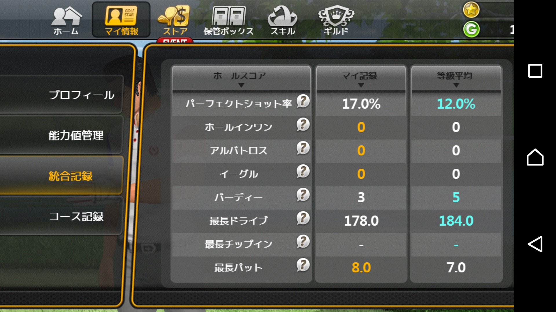 「マイ情報」の「統合記録」から、自分のプレイ記録を見ることができます。平均値と比較できるので、