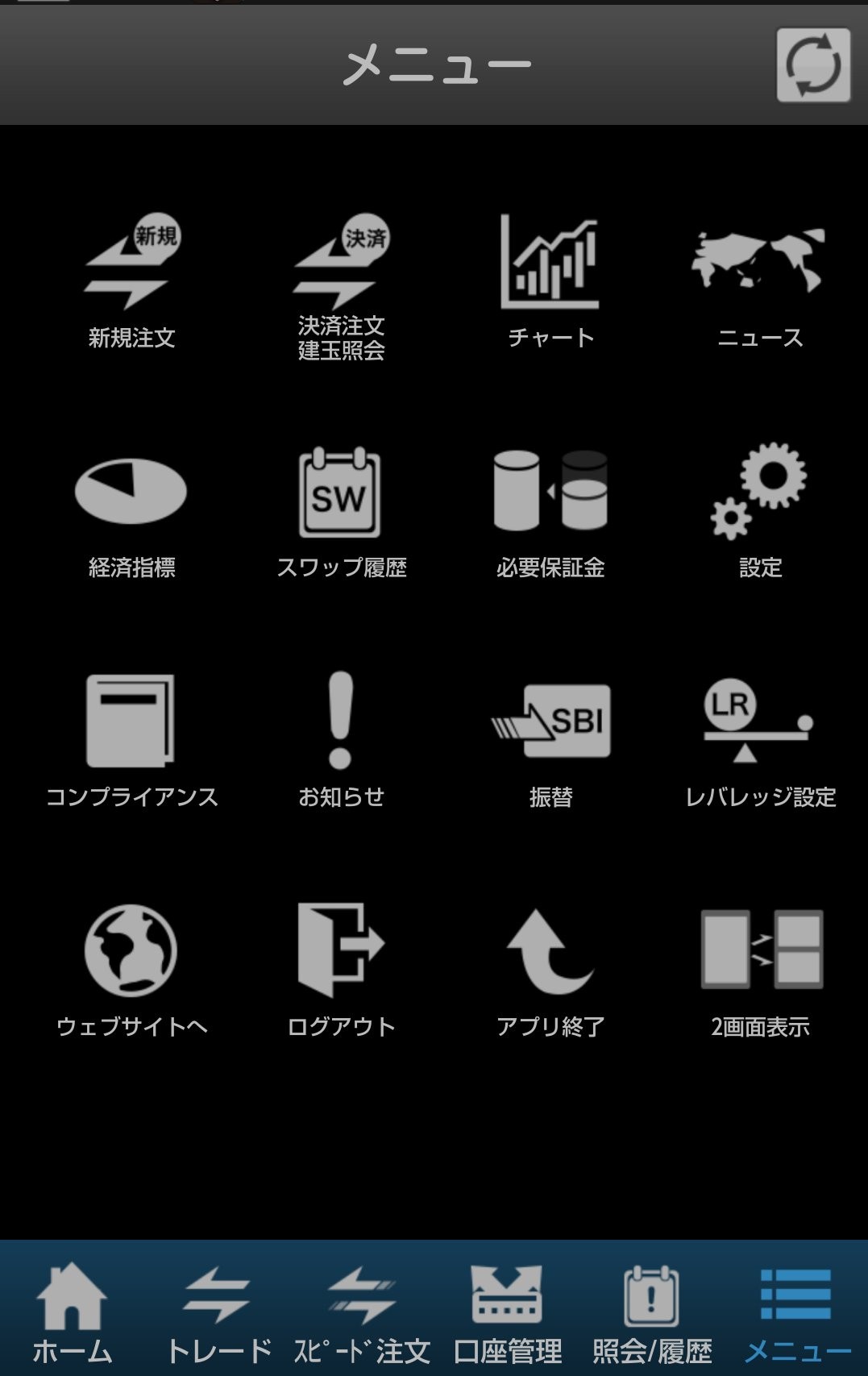 先ずは、「メニュー」画面内の設定で、通貨ペア順番、取引、及びログイン設定、並びにスピード注文設定と