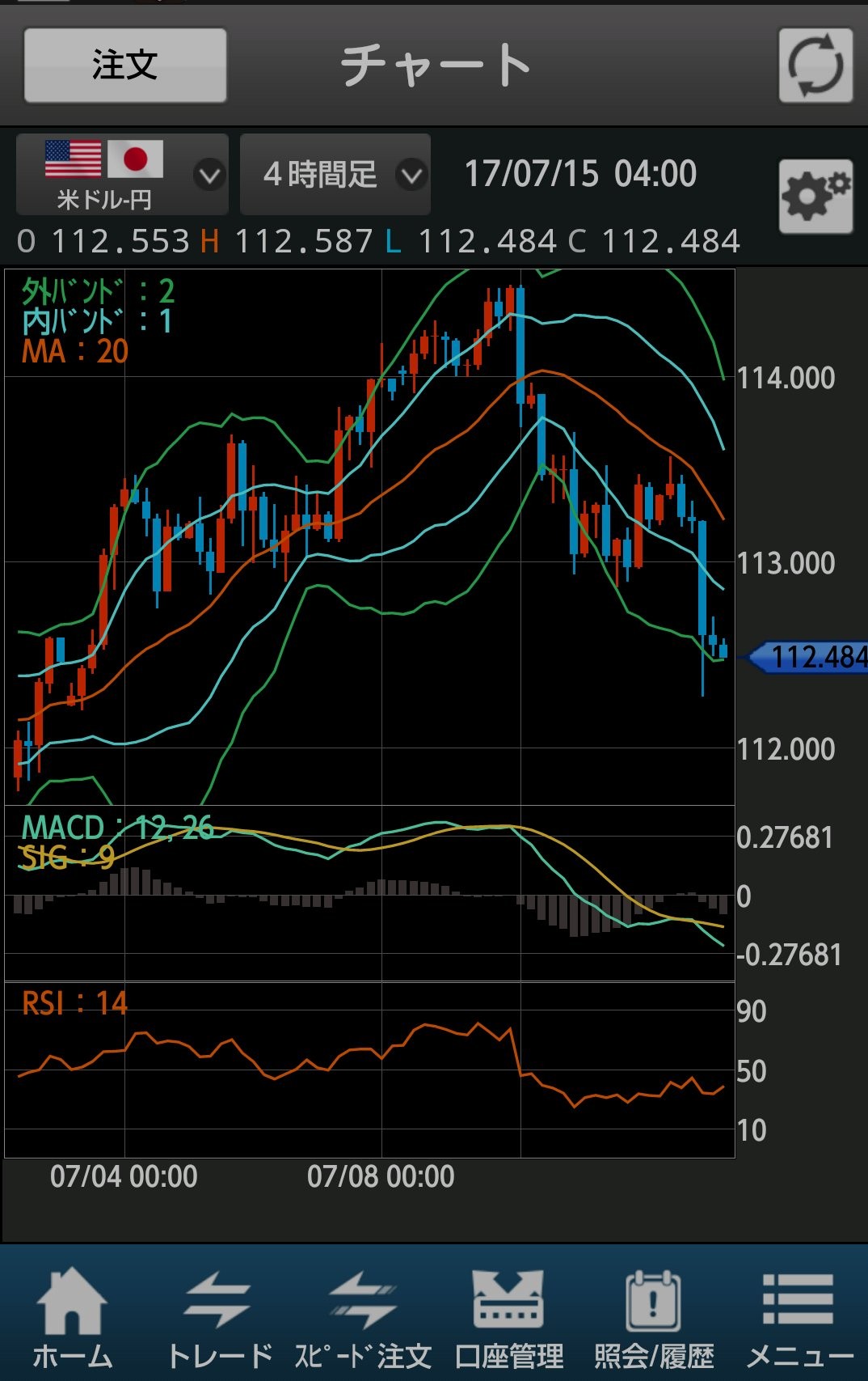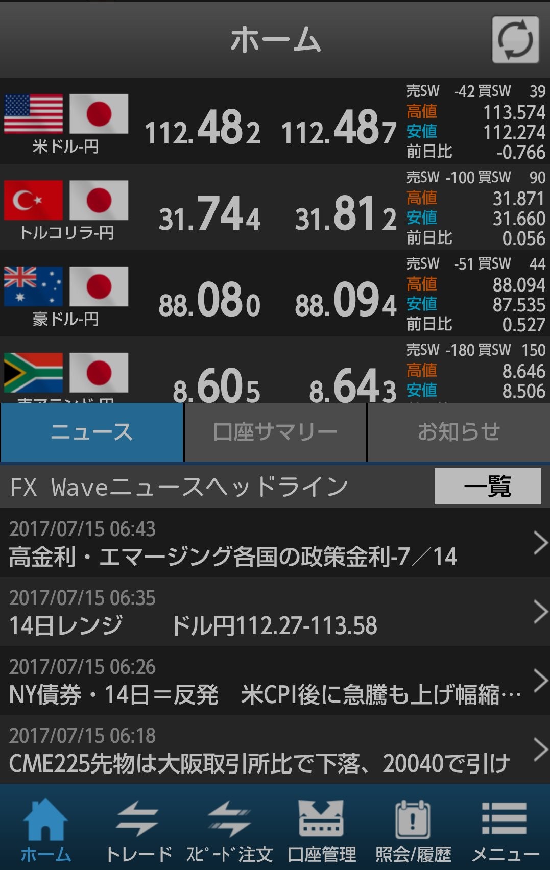 ログイン後、「ホーム、トレード、スピード注文、口座管理、照会/履歴、メニュー」の6機能が、