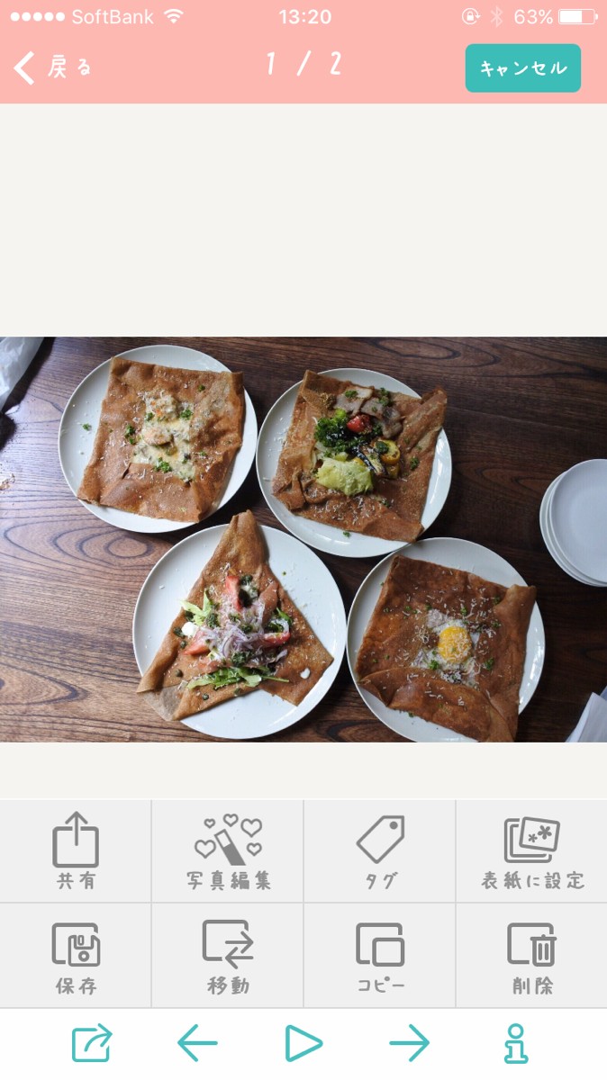 使い方はとても簡単です!下に表示されたカレンダーのアイコンを押すと、カレンダービューでアルバムを表示。また、アルバム内にある写真を選択して、下の1番左に表示されたアイコンを押すと、写真の編集や共有機能までも使えます。