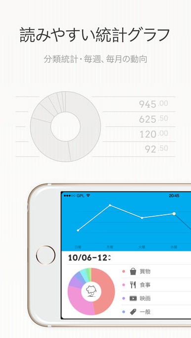 統計グラフも円グラフ、折れ線グラフと収支のバランスや支出の使い道がぱっと見てわかるようになっているので、家計管理をワンランクアップさせてくれる便利な支出追跡アプリになっています。