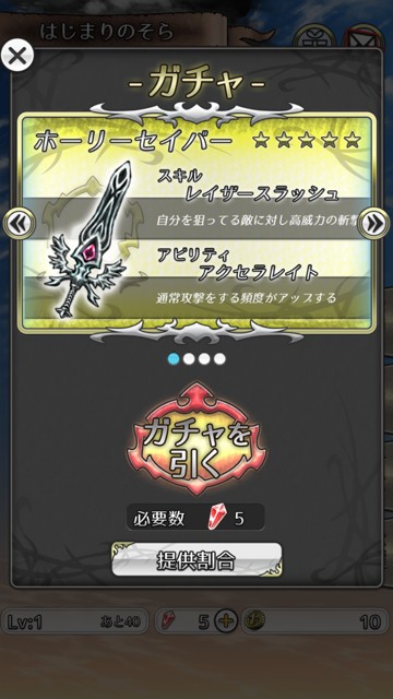 ステージ画面からサイドのボタンで武器のガチャを引くことができ、ガチャはジェムを集めないと引くことができません。コインを集めてジェムと交換するか課金をすることで買うことができます。