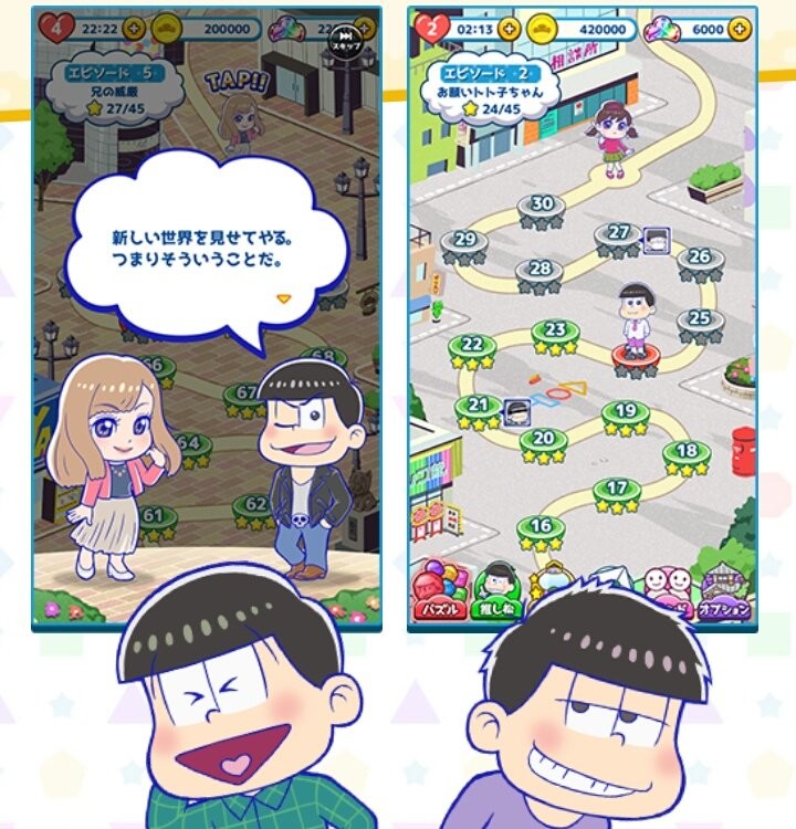 新品を卒業したい6つ子たちが街に繰り出し、原作にはないオリジナルのストーリーでステージを進めていきます。