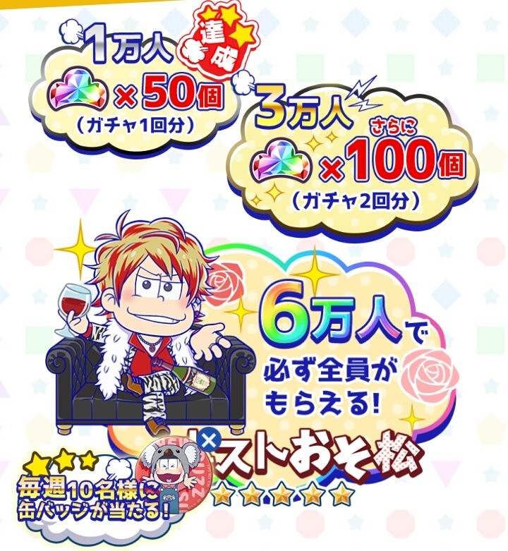 登録者数に応じて豪華賞品が用意されていて、最大6万人突破でレアリティの「高いホストおそ松」が入手できます。
