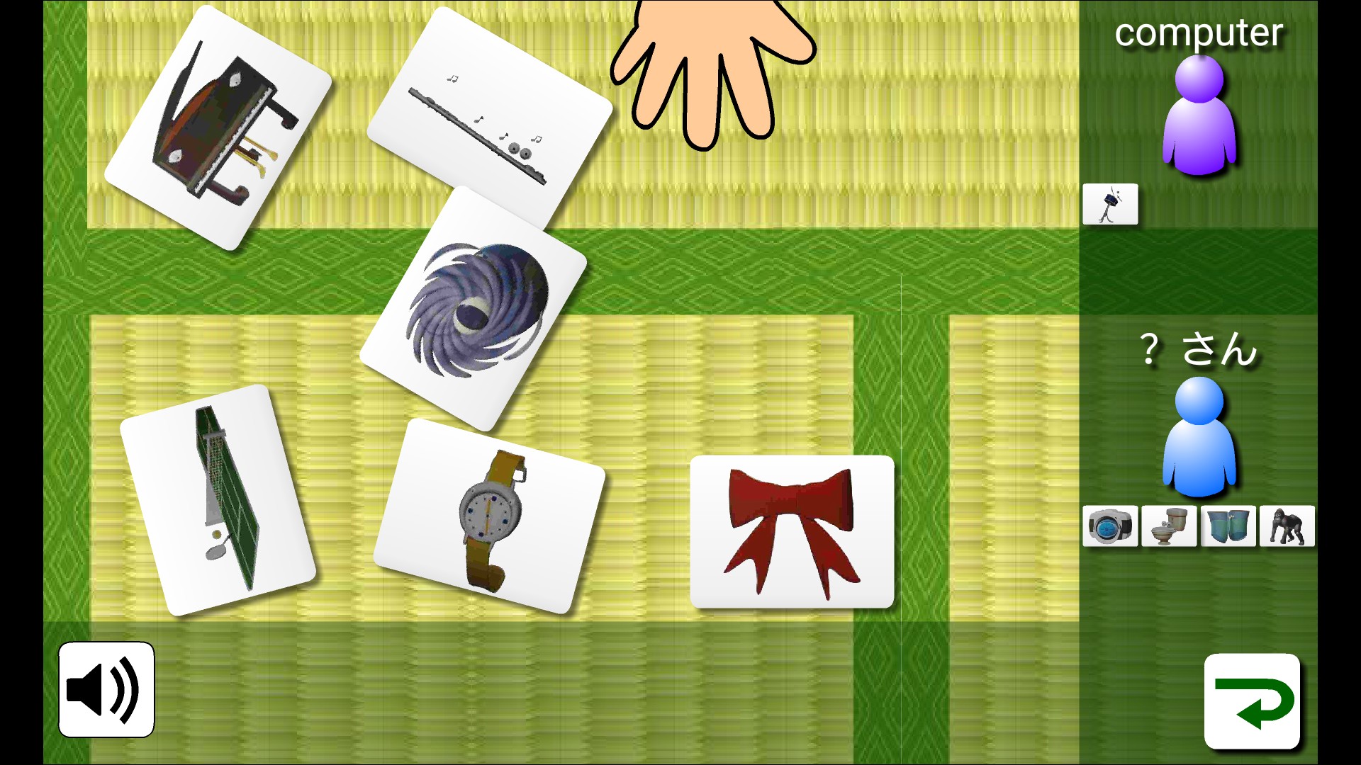 英単語カルタは、イラストと英単語カードの2種類から選べます。難易度によって対戦相手のコンピューターがカードをとる速度を変えられるので、幼い子供でもストレスなく遊べますね。