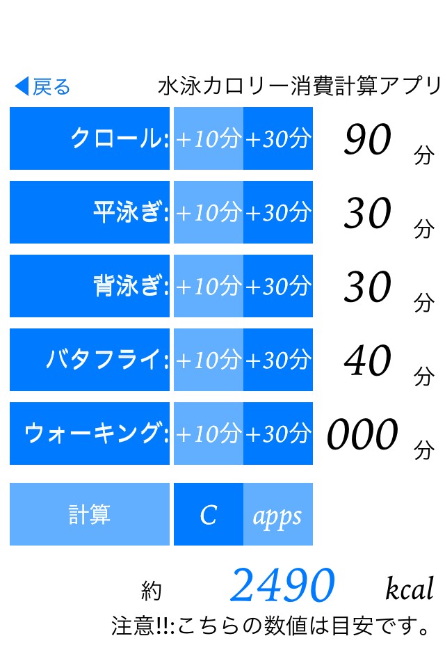 シンプルな機能が売りの、カロリー計算アプリです。計算できる項目はクロール・平泳ぎ・背泳ぎ・バタフライ・ウォーキングとなっているので、プールに行くまでの移動と、着いてからの練習をまとめて計算することができますね。自分の泳ぎが体に対してどのくらいの影響を与えているのか知りたいときは、こちらのアプリでカロリー計算を行ってみましょう。