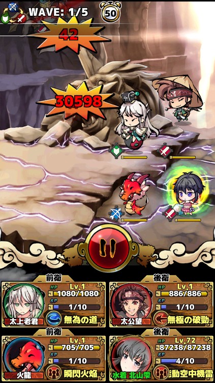 バトルで姫神が進んで行く分にはオート式になっているので自動で進んで攻撃をしてくれます。戦闘画面を見てみると4人のキャラクターたちが配置されていてどこにどの姫神を配置するかによってバトルの勝敗が決まってきます。バトルの準備ができたら真ん中にある「出撃」のボタンをタップするとバトルが開始します。道中姫神が攻撃を受けて危険な状態ならば姫神を後衛に位置をチェンジすることができます。その時はもう一度真ん中にある「赤いボタン」をタップすれば前衛と後衞の位置をチェンジすることができます。戦闘を開始する時は「出撃」で開始しましょう。画面左上に「WAVE:1/5」と書いてあり、これが5/5になるとボスが出現します。ここにはボス戦に来た時に「20ターンでボス狂暴化」との表示が現れます。できるだけ20ターン以内に勝利するようにしましょう。