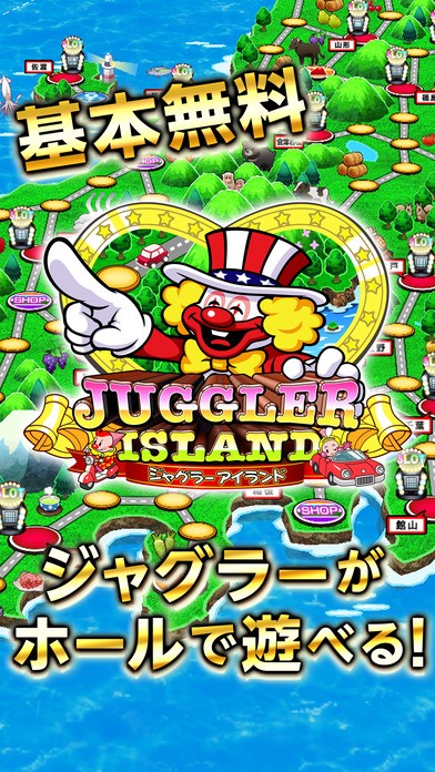 ジャグラーアイランドはジャグラーを十分堪能できる無料ゲームアプリです。全国各地のホールが赤マスで表示されているので行きたい場所に向かいましょう。