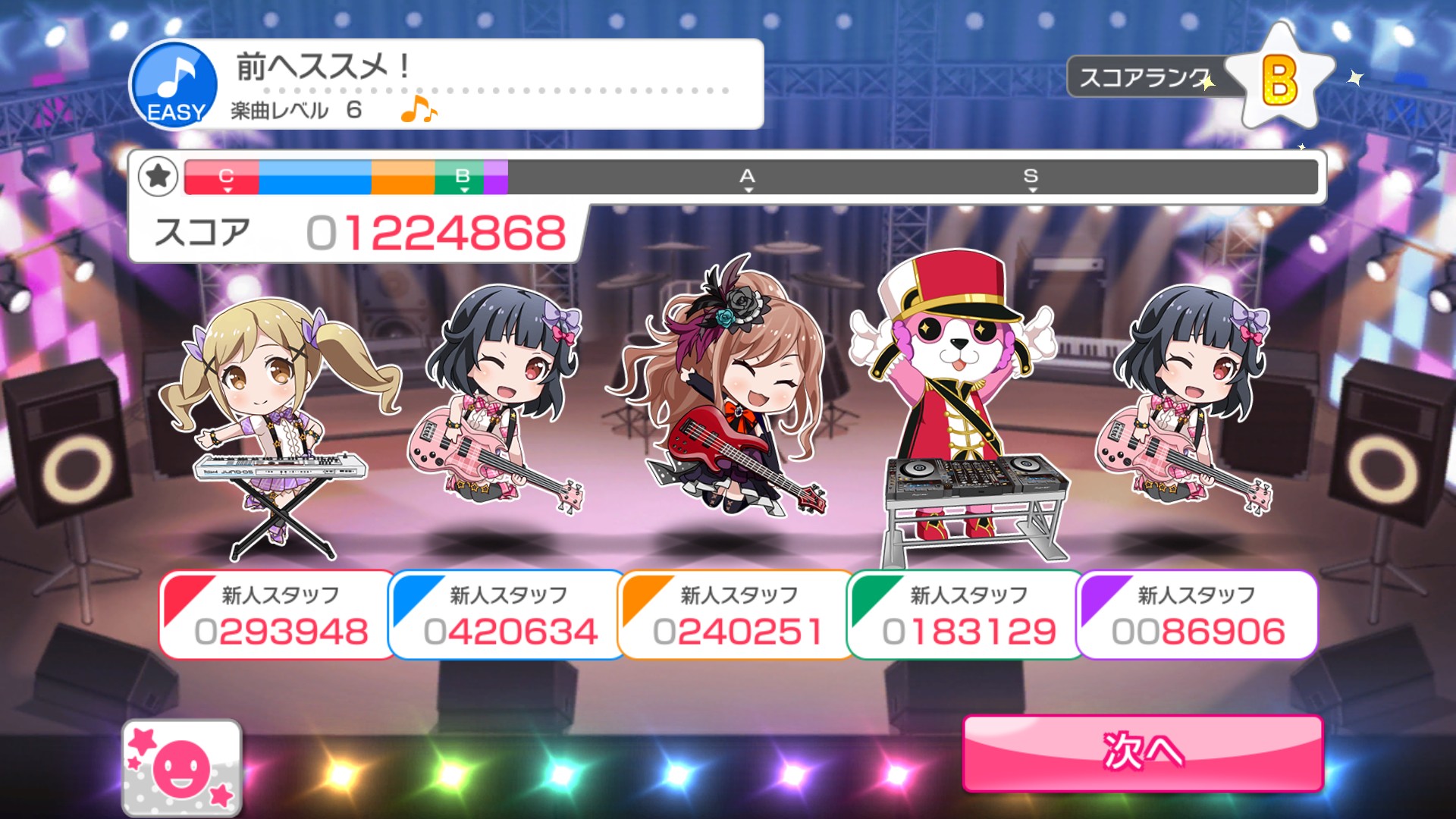 アドベンチャーパートでは、キャラクターのエピソードを見ることで経験値とが貯まるので、そこでプレイヤーランクと各バンドのバンドランクを上げてストーリーを開放していきます。