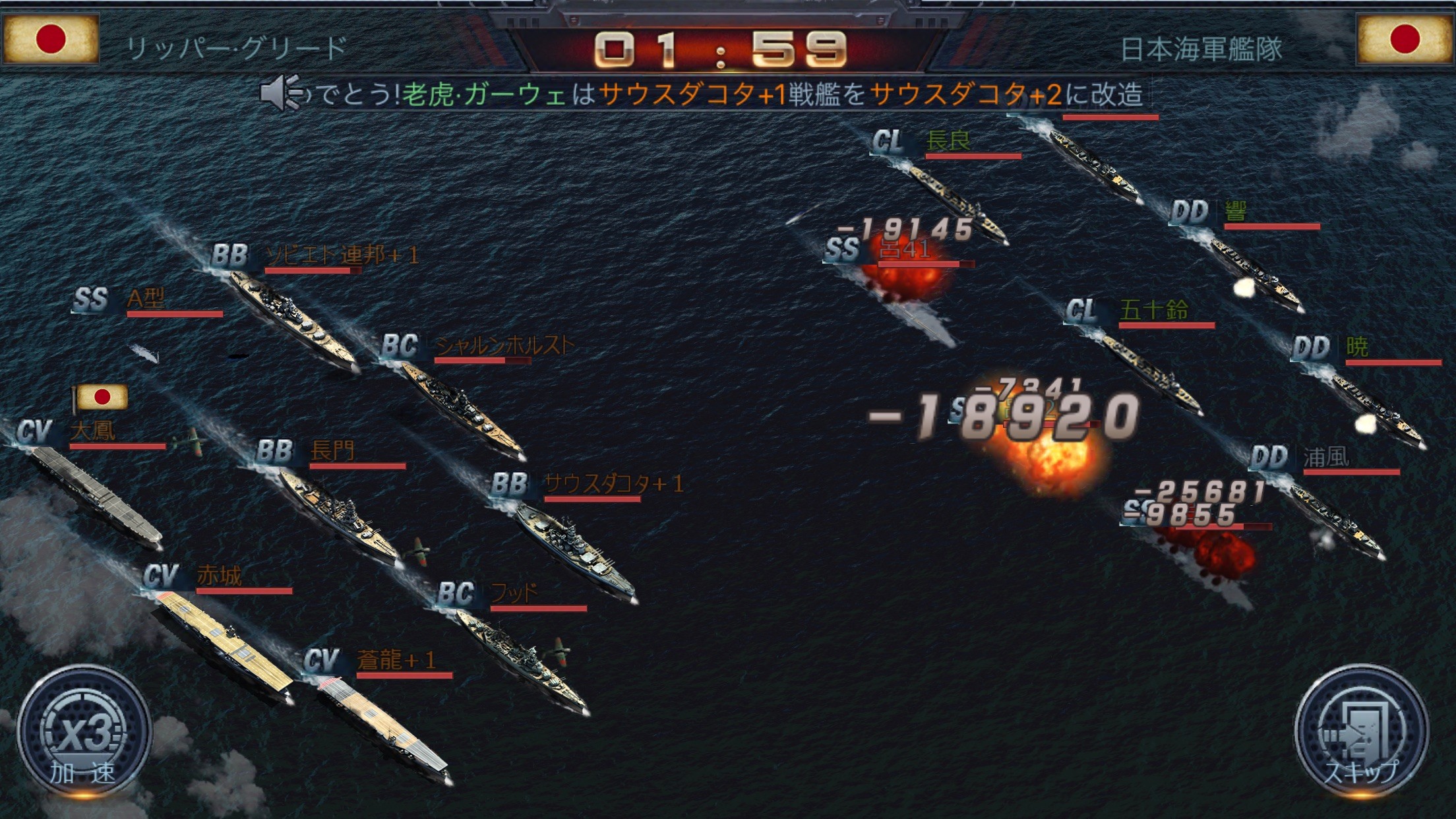 攻撃はミサイルや魚雷、戦闘機による通常攻撃と、それぞれの戦艦に特化したスキル攻撃の2種類があります。