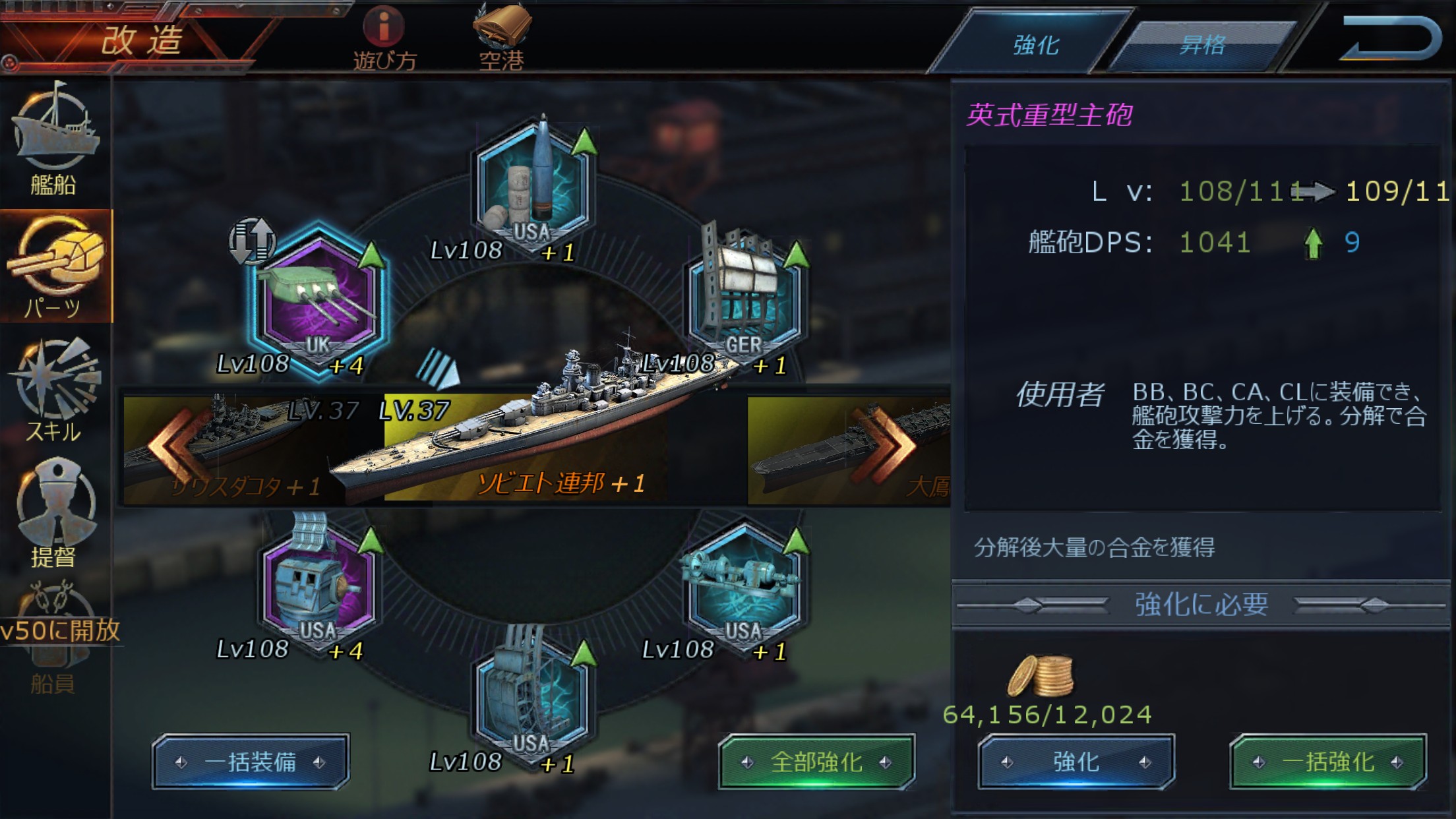 項目を強化していくことで戦闘能力が高まりますが、1番大きなところは戦闘にさんかできる戦艦の数が増やせられることにあります。