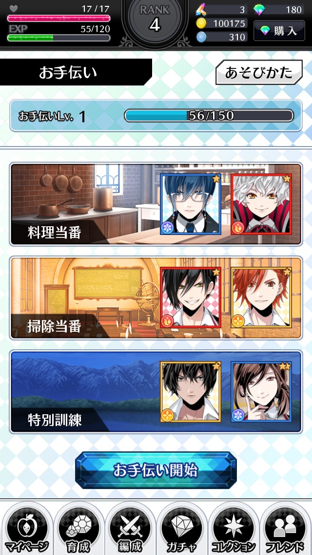 お手伝いの画面では、キャラクターが2人1組となって料理、掃除、訓練のお手伝いをしてくれます。