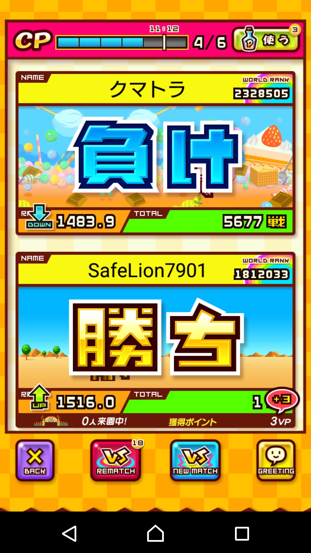 同じ動物を3つ並べて消していくのは基本のズーキーパーと変わりません。制限時間いっぱいまで消しまくり、時間が来るとここで相手とのバトルになります。パズルモードで消した動物たちの攻撃力と防御力の合計が表示され、その数値の分それぞれの体力を削り合います。それを最大5戦繰り返します。もちろん5戦目に突入する前に倒すことも可能ですが、5戦までもつれ込んだ場合は残り体力で勝敗が決まります。