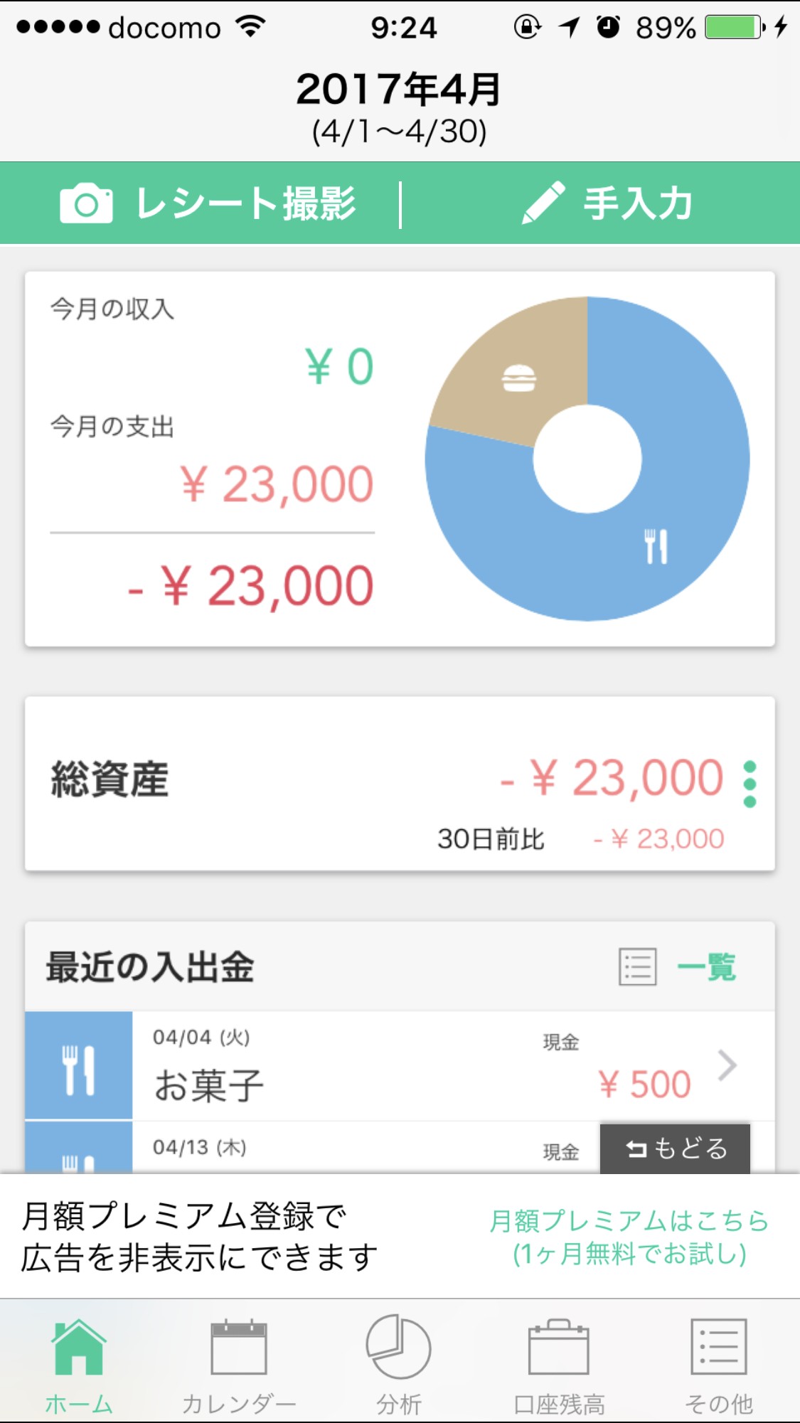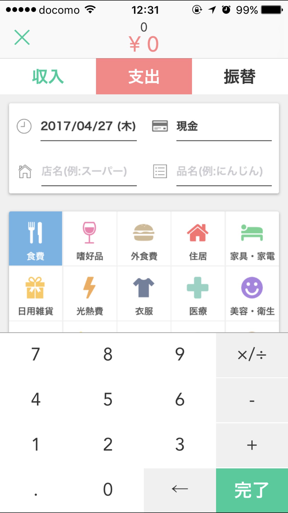 もちろん手入力もできますので、領収書やレシートのない買い物は自分で入力しましょう。