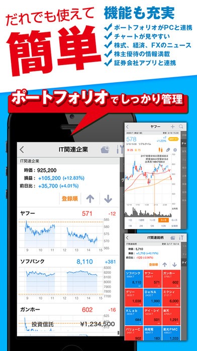 株価・為替や、ポートフォリオ、経済ニュースをチェックしたり、新たな投資銘柄を探したり、とても便利に利用できます。