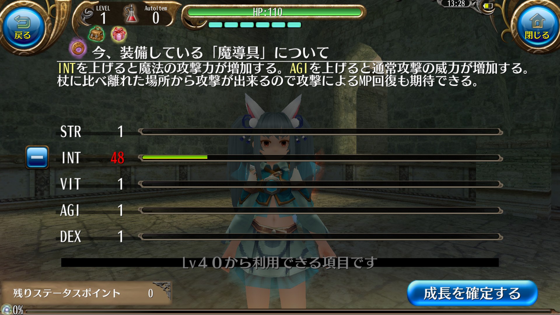 両手剣で火力として戦いたいならSTRを上げたり、盾を装備してタンクがしたいならVITを上げたり、魔法ぶっぱしたいならINTを上げたり。