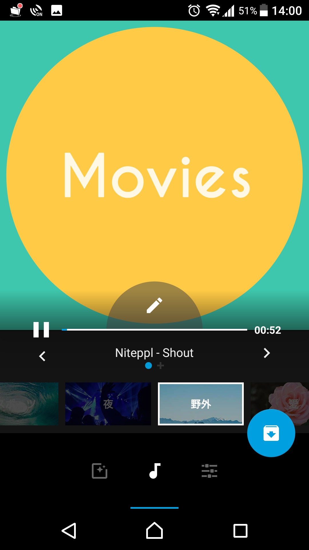 プリセットされている音楽が、「夏」「野外」「映画」「友達」など、音楽のイメージでカテゴリー分けされています。BGMをオフにする場合は、ここから「音楽なし」を選択します。「マイ ミュージック」をタップすると、スマートフォンに入っている音楽を選ぶこともできます。