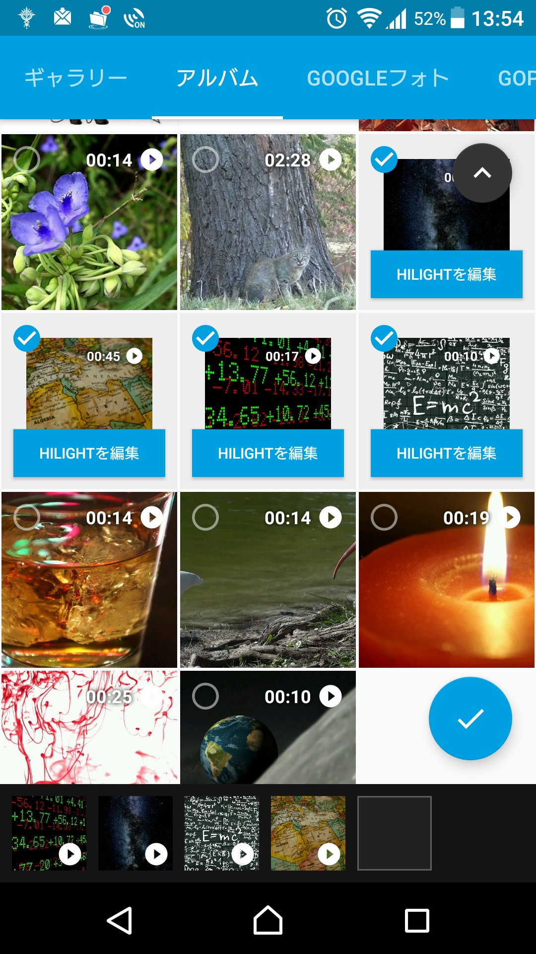 好きな映像や画像をタップで選んでいきましょう。データは複数選択することができ、また、映像と画像が混在していてもかまいませんが、使用できる動画と画像の数は合計で75個までとなっています。