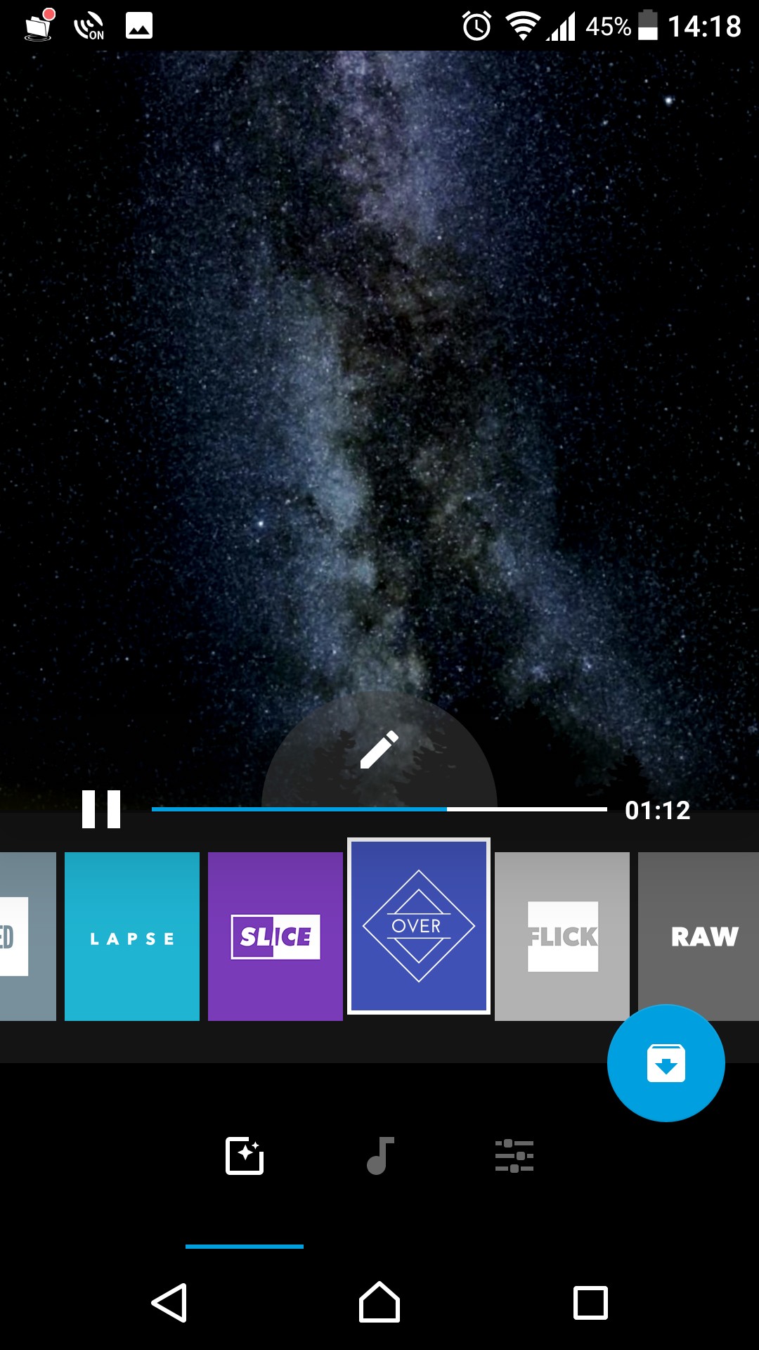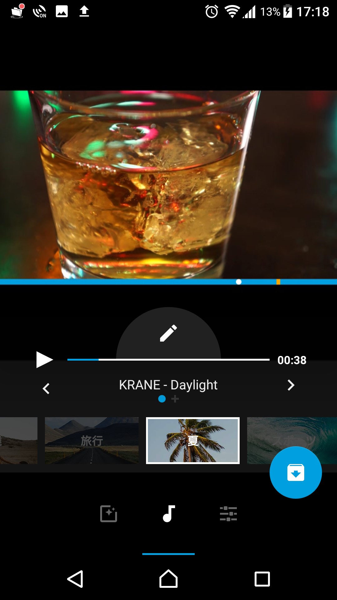 タイトルの入力を終えるか、入力をスキップすると、タップして選択した順番につなげた一本の動画が完成しています。ここからいろいろな効果をかけたり編集したりという作業に移ります。上の画面では作成した動画が流れています。下のメニューから画像または動画のトランジット時に使うエフェクトを選択すると、上に反映されます。パターンは全部で23種類。気に入ったエフェクトを選択したら、次に画面下の音符のマークをタップして、BGMの選択に移ります。