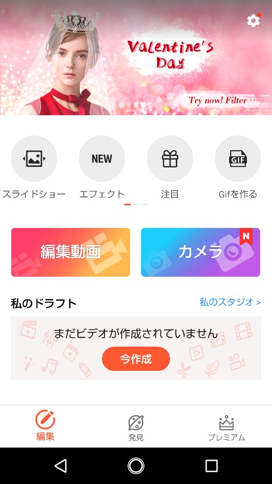 トップ画面から既にある動画や画像を使用して編集することもできますが、カメラボタンで撮影して鮮度の高い動画を作成も可能です。