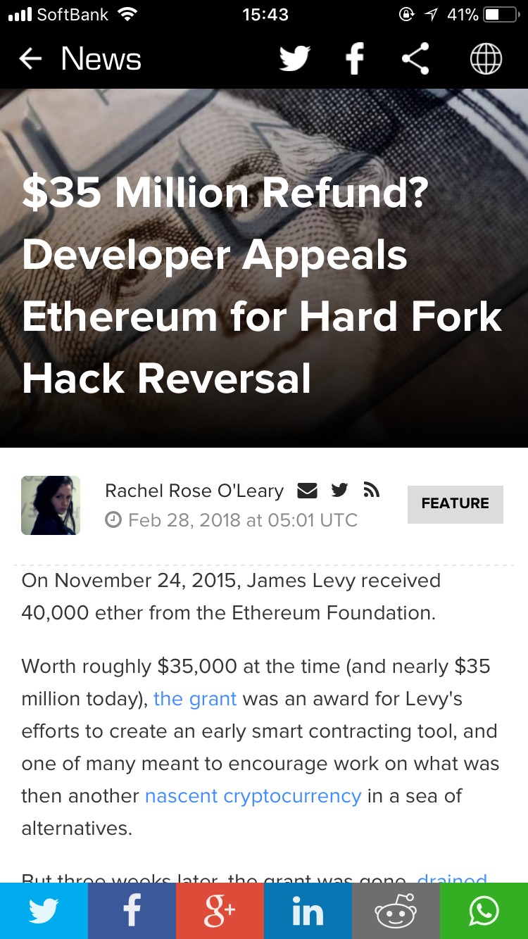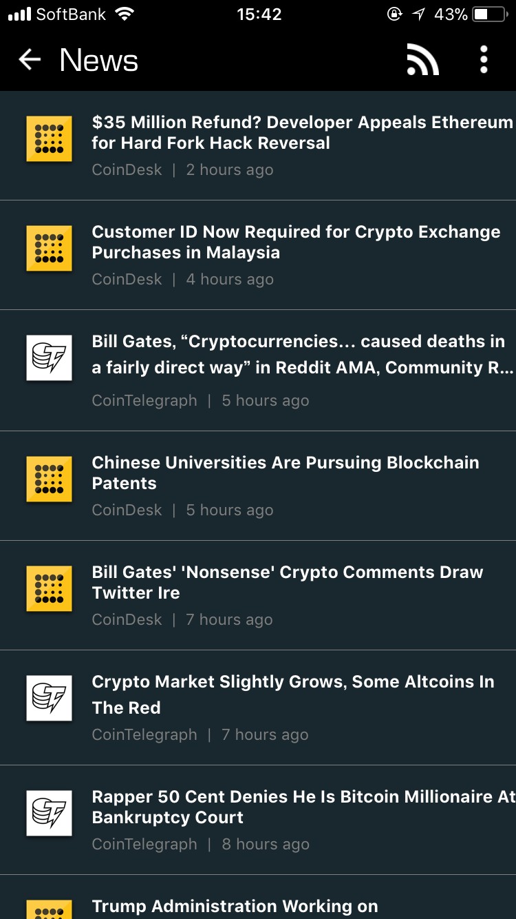 右上にある新聞紙のマークをタップすれば仮想通貨に関するニュースを英語で読むことができるのです。
