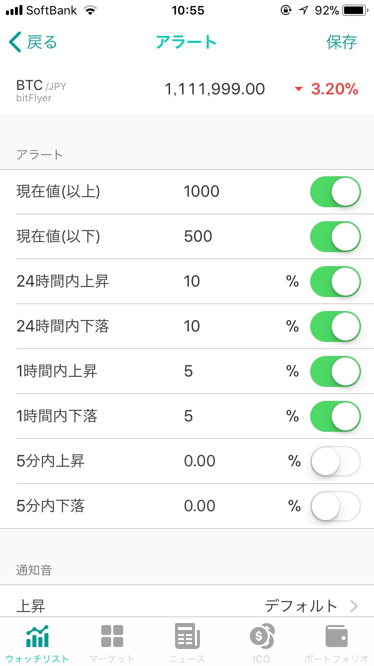 と、価格と上昇下落率それぞれにアラート設定できるのがポイント。数値を自分で設定することができるので、望んだポイントで通知が届きます。