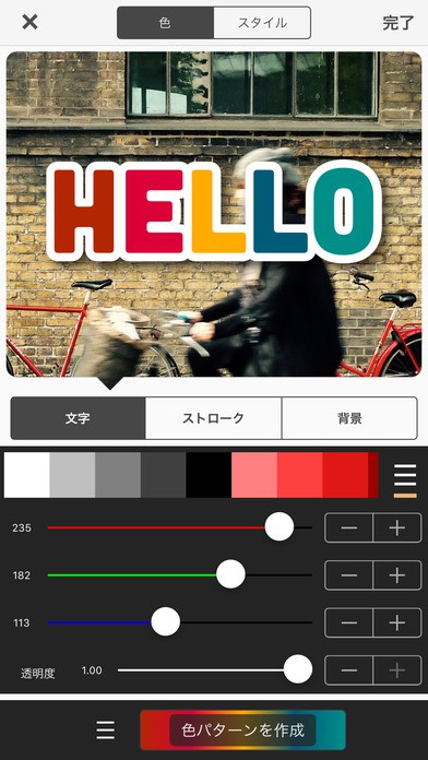 - 文字のスタイル変更(色、塗りつぶし、縁取り、透明度など)