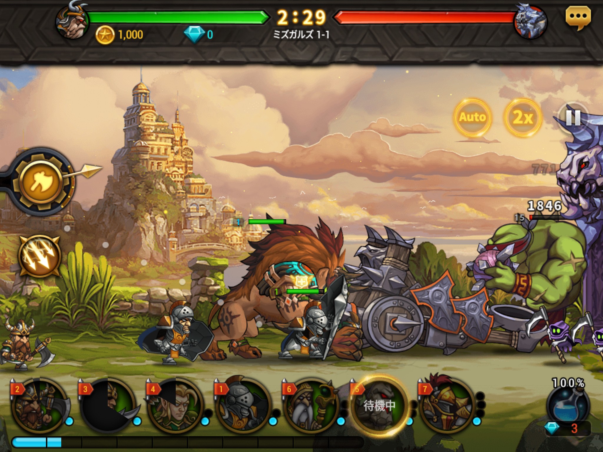 召喚マナがたまったユニットアイコンをタップするとユニットを召喚、敵モンスターや敵陣地を攻撃してくれます。