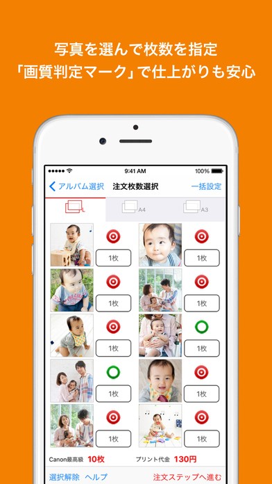 ⑤1枚の写真に対してのプリント数を決めます。1枚ごとでも、一括でも枚数を決めることができます。『注文ステップへ進む』をタップします。
