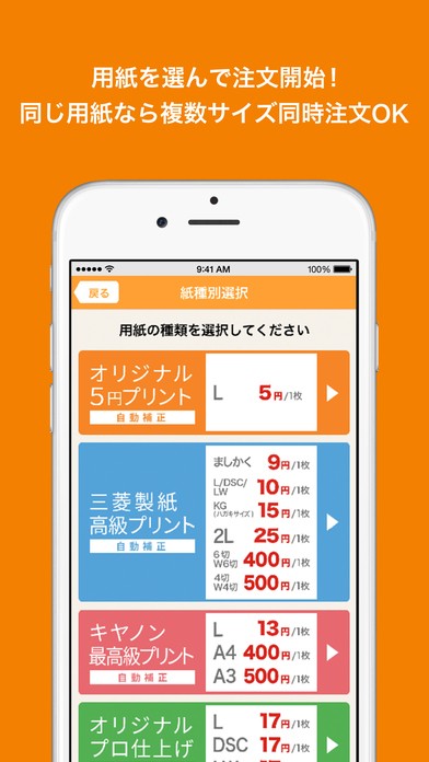 三菱製紙高級プリント:ましかく(89×89mm)9円、L/DSC/LWサイズ10円、KG(ハガキ)サイズ15円、2Lサイズ25円、6切/W6切400円、4切/W4切500円