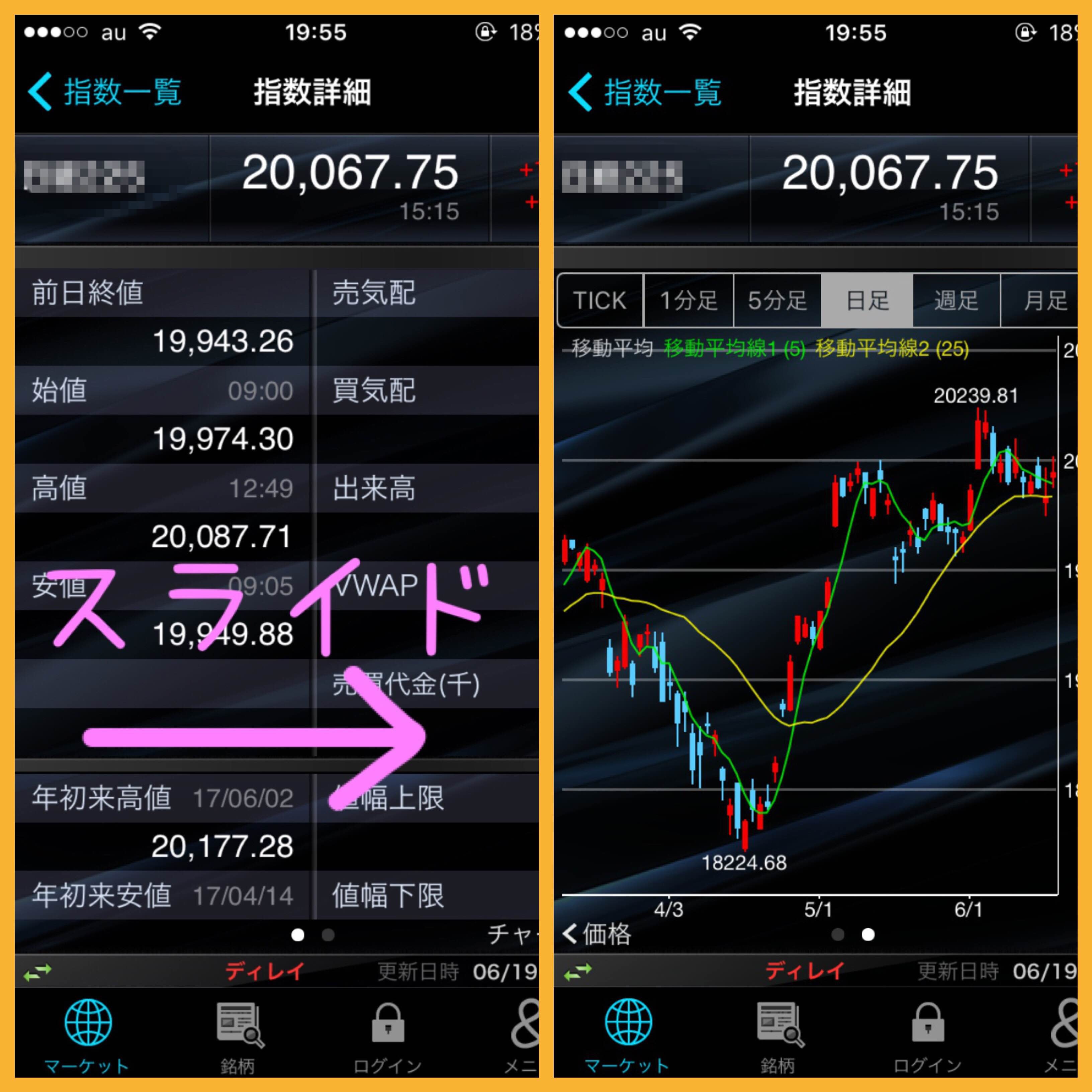 「指数」や「為替」では、それぞれ銘柄や通貨をタップすることで、「前日終値」「始値」「高値」「安値」