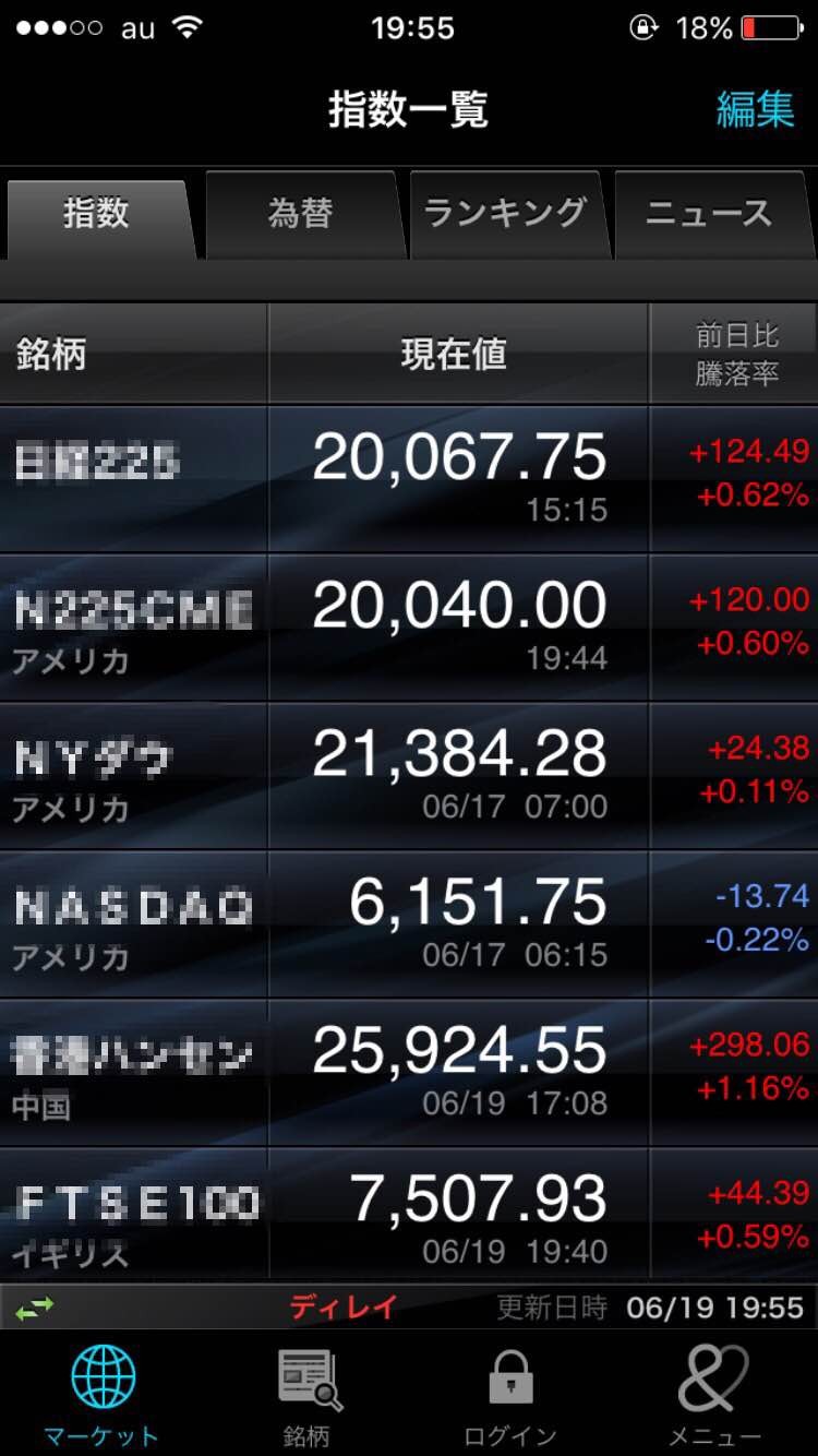 アプリトップ画面では、「指数」「為替」「ランキング」「ニュース」と各項目が並んでいます。