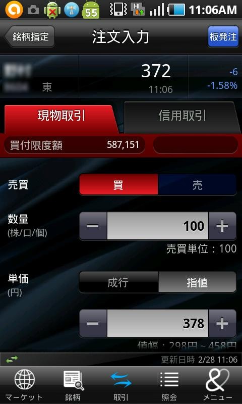 この取引画面で、各項目を入力してタップすれば簡単に発注することができます。