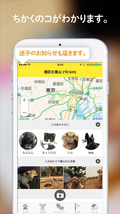楽しいですね。万が一自分の犬・猫が迷子になってしまった時には「エリア」から迷子探しの情報をアップできるのも心強いですね。