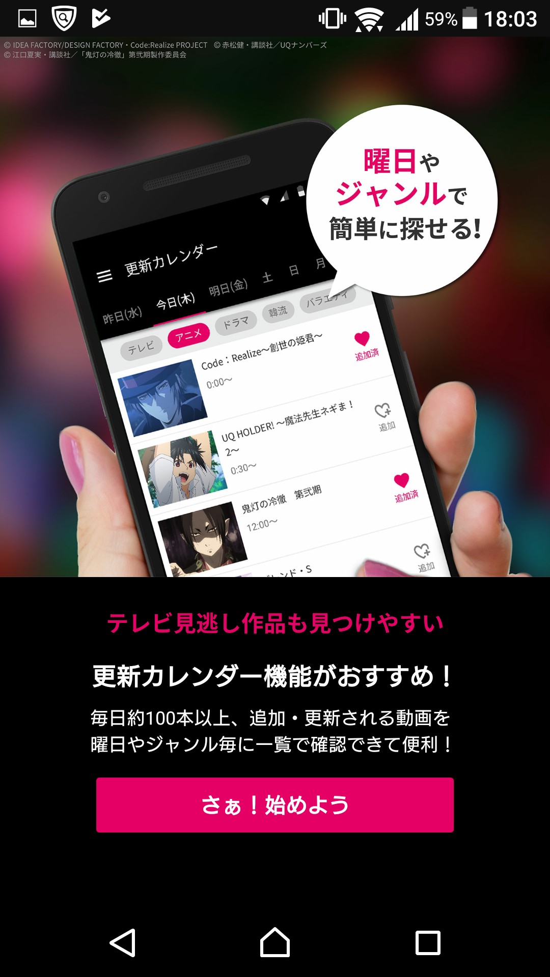 視聴できる動画は曜日ごとに毎日更新されるので、飽きることなく長く楽しめるアプリでもあります。