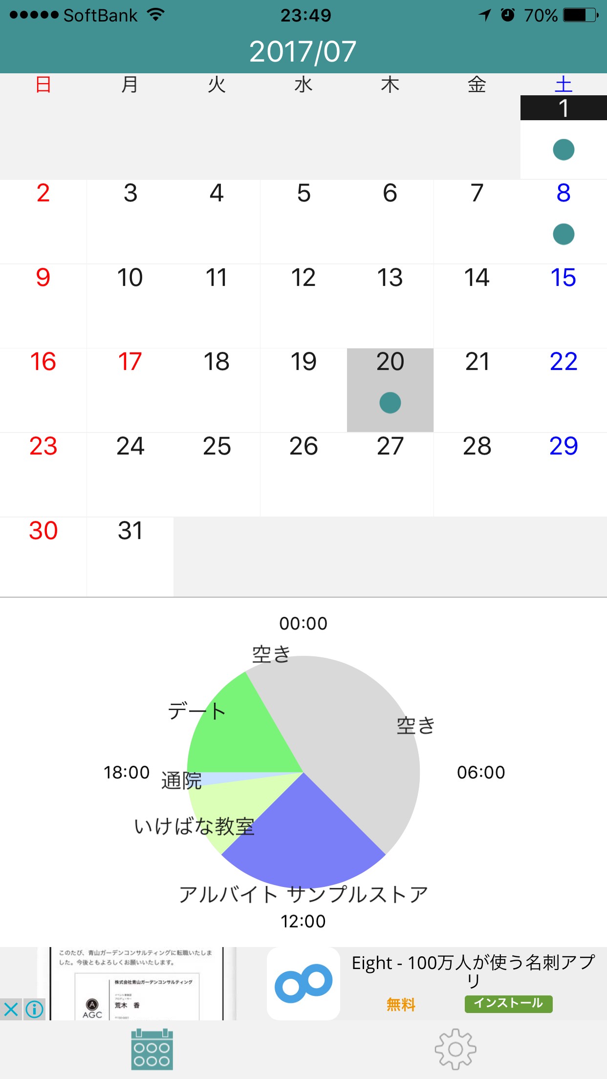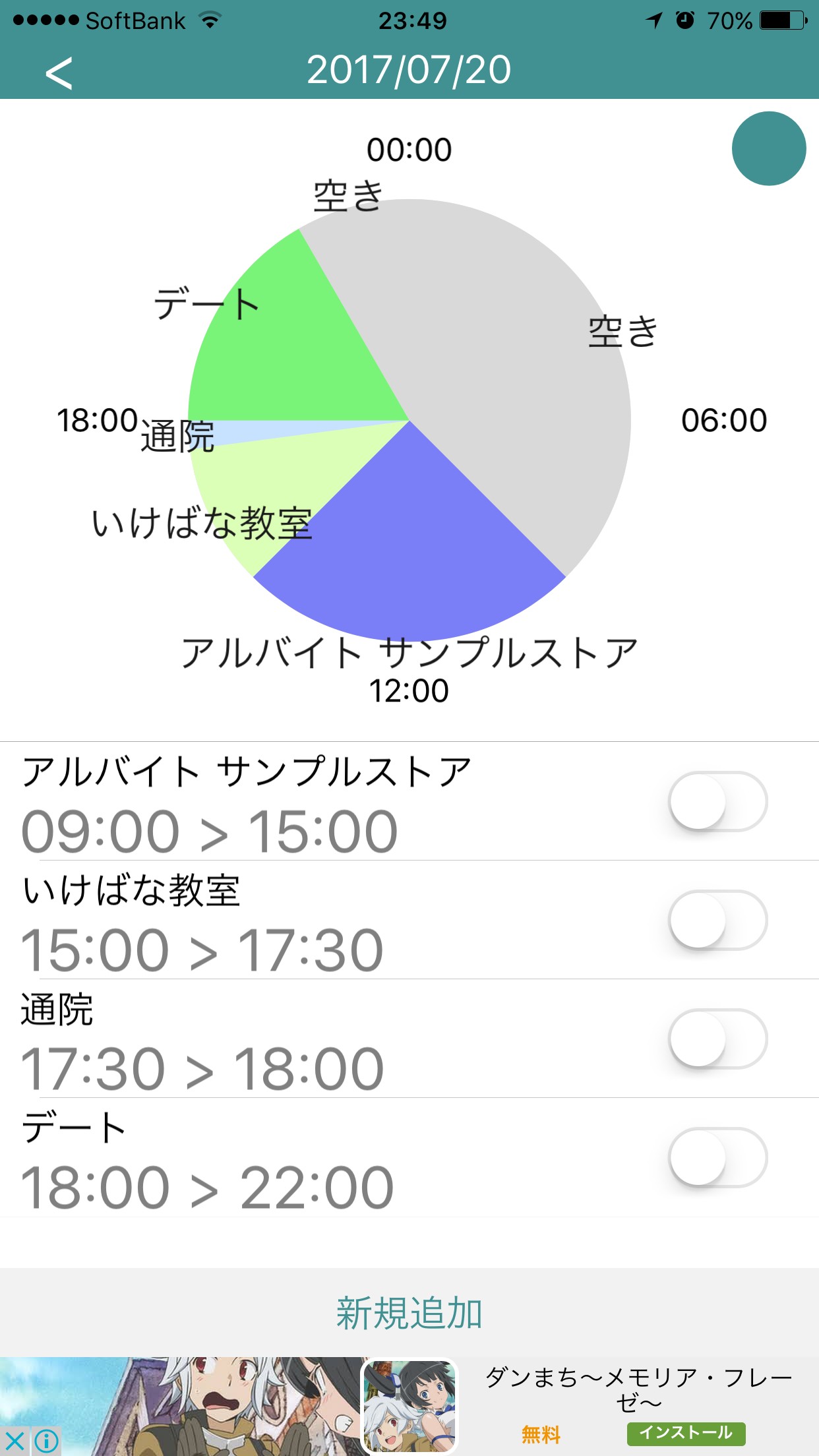 カレンダー上で「予定あり」のマークがついている日をタップすることで、カレンダー下に円グラフでタイムスケジュールが表示されます。