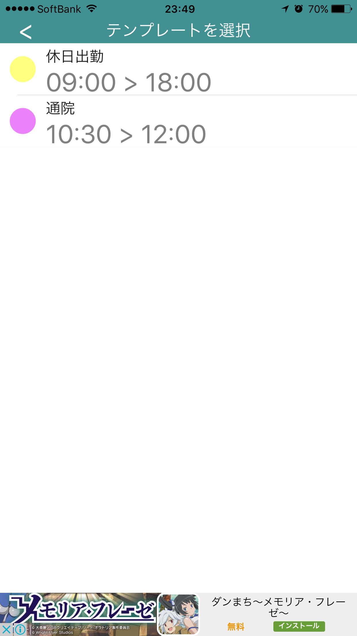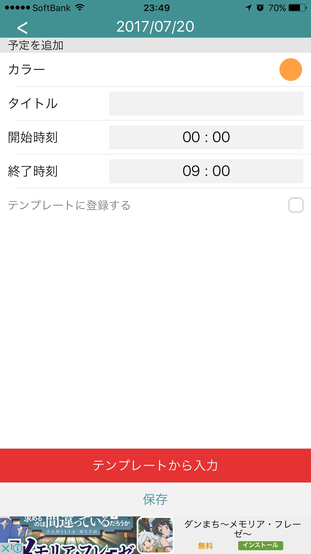リストからテンプレートを選択すると、表示色、タイトル、開始時刻、終了時刻がテンプレートの中身に書き換わります。