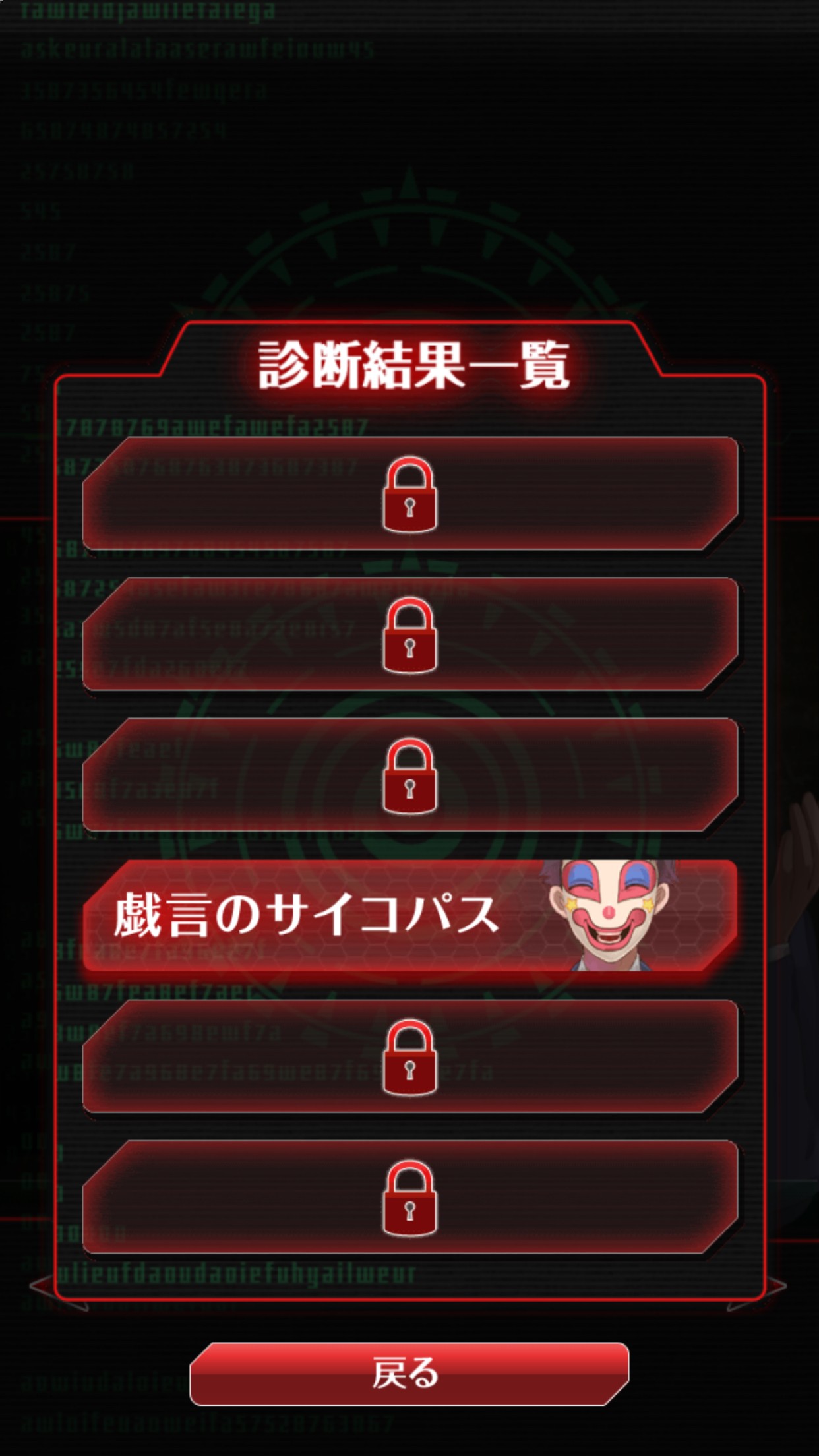 このゲームアプリでは診断結果一覧をいつでも見ることができ、診断結果は全部で6種類あります。他の診断結果が気になります!また、自分は「戯言のサイコパス」だったけれど、他の人はどんなサイコパスでどんな闇を抱えているのだろう。と、気になります。このゲームアプリを友だち同士やパーティなどでみんなでプレイすれば、きっと盛り上がること間違いありません!友だちやパーティで知り合った人に診断してもらって、どんな人なのか、この診断結果一覧を見ればすぐに分かります。診断結果がいつでも見れるのがいいですね。友だち同士、パーティなどの暇つぶしや息抜きなどにも最適なゲームアプリともいえます。