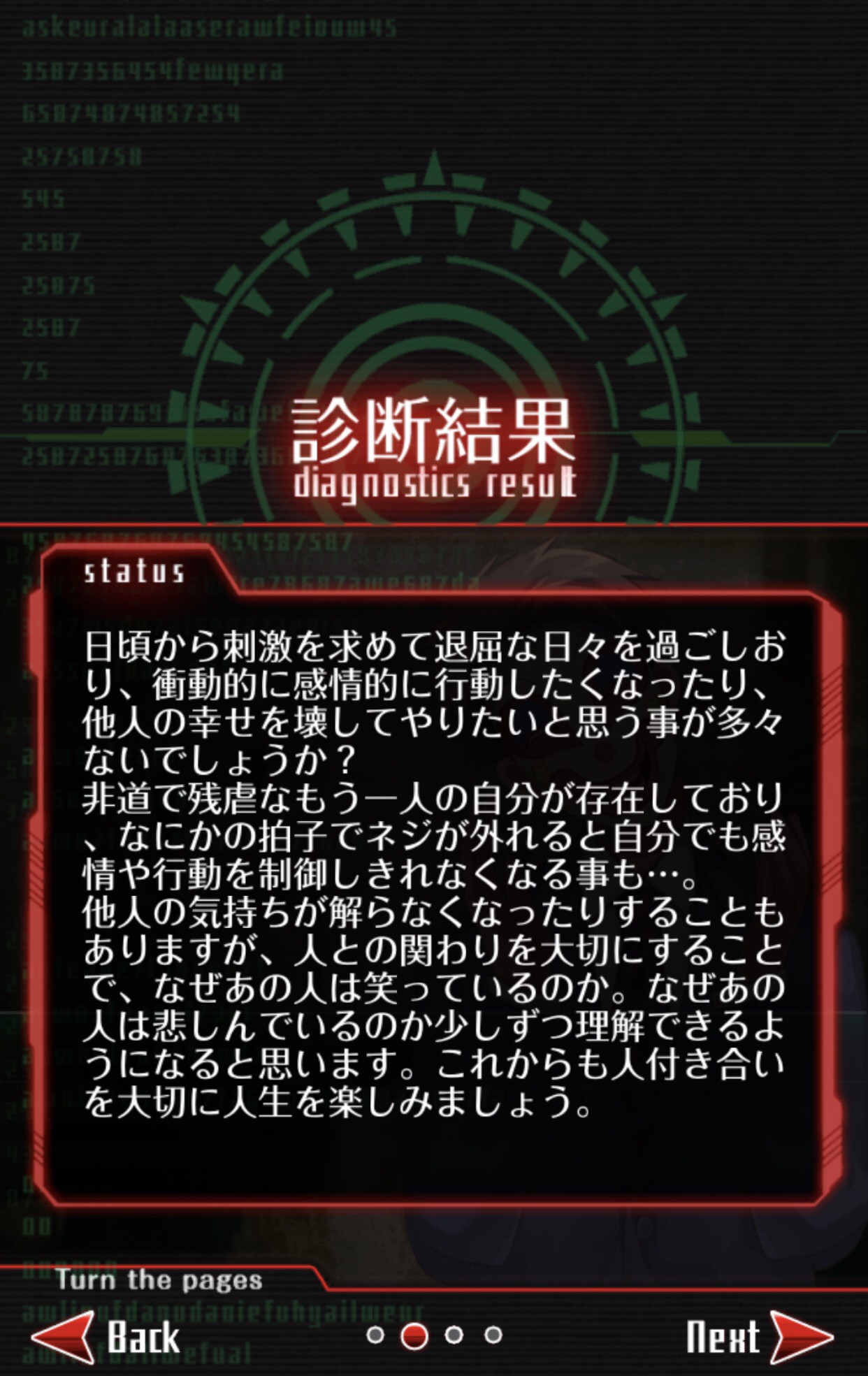 どんなサイコパスなのかが表示されると、次に診断アプリらしく、診断結果が表示されます。自分が普段からどんな闇を抱えているのか。そしてこれからのアドバイスもきっちり診断してくれます。面白いネタ系の診断アプリかと思いきや、診断結果がしっかりとしたもので驚きました!このゲームアプリの診断結果を読んで、自分はこんな闇を抱えているんだということがよく分かりましたし、自分の闇と向き合ういいチャンスだとも思えます。どんなサイコパスと診断されるだけでなく、しっかりとした診断結果があるのがいいですね!